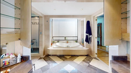 A super-sized master bedroom with a large bathroom with a jacuzzi, double sinks, shower area, and a double walk-in closet.